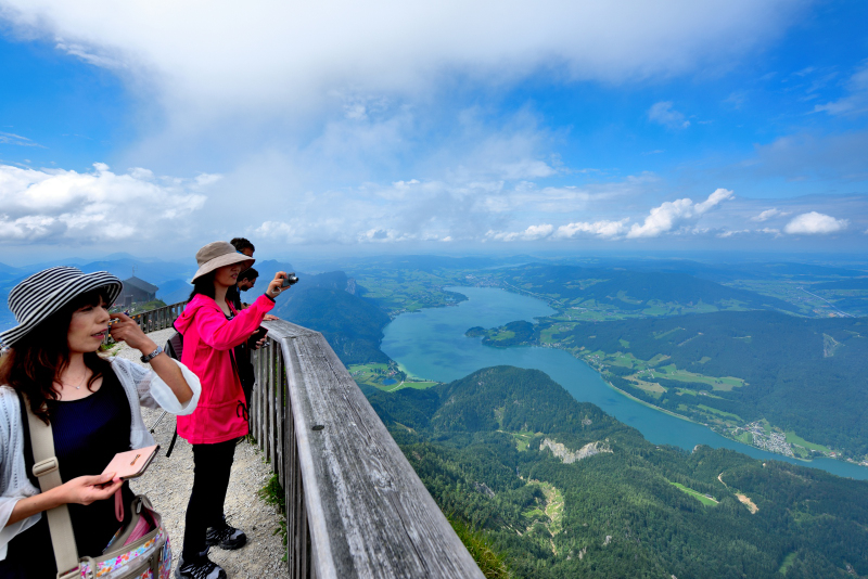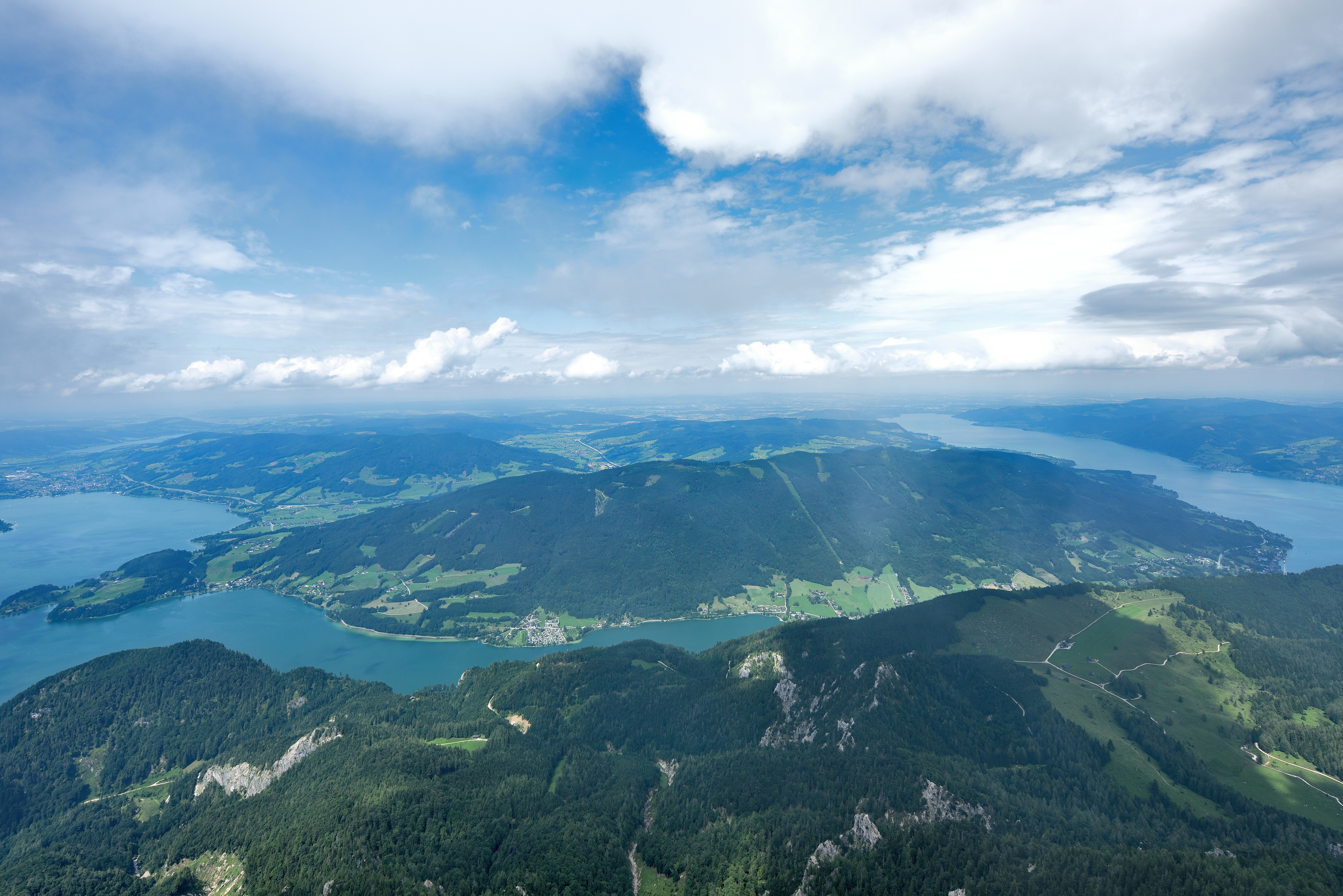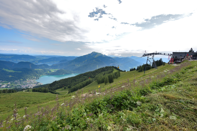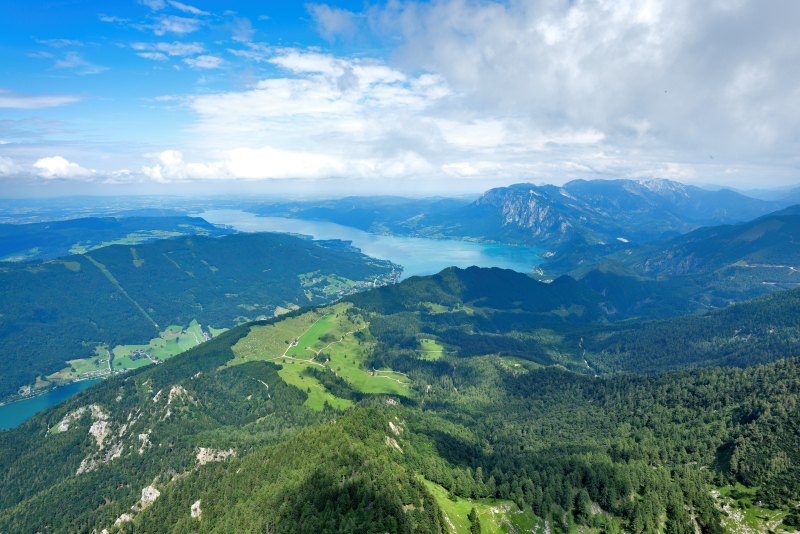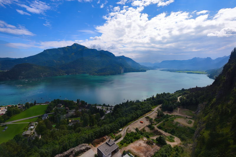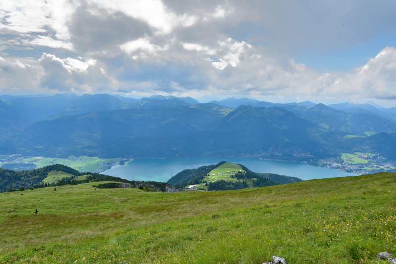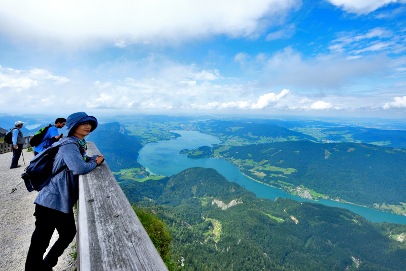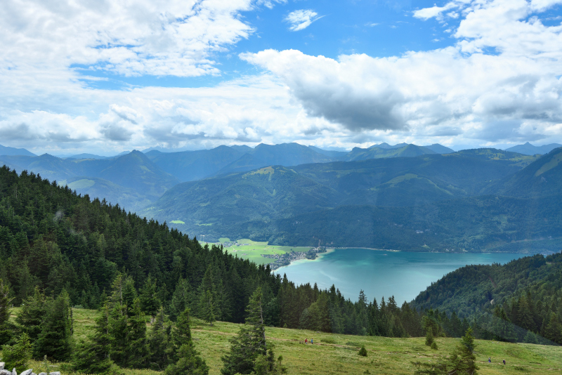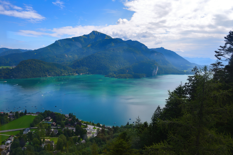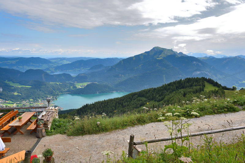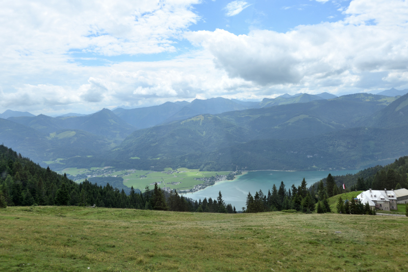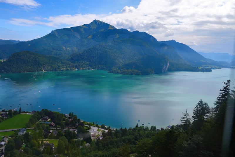 眼下に見えるのは、ヴォルフガング湖 [Wolfgangsee] と、その北西湖畔に位置するザンクト ギルゲン [Sankt Gilgen] の町。