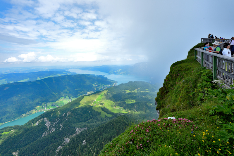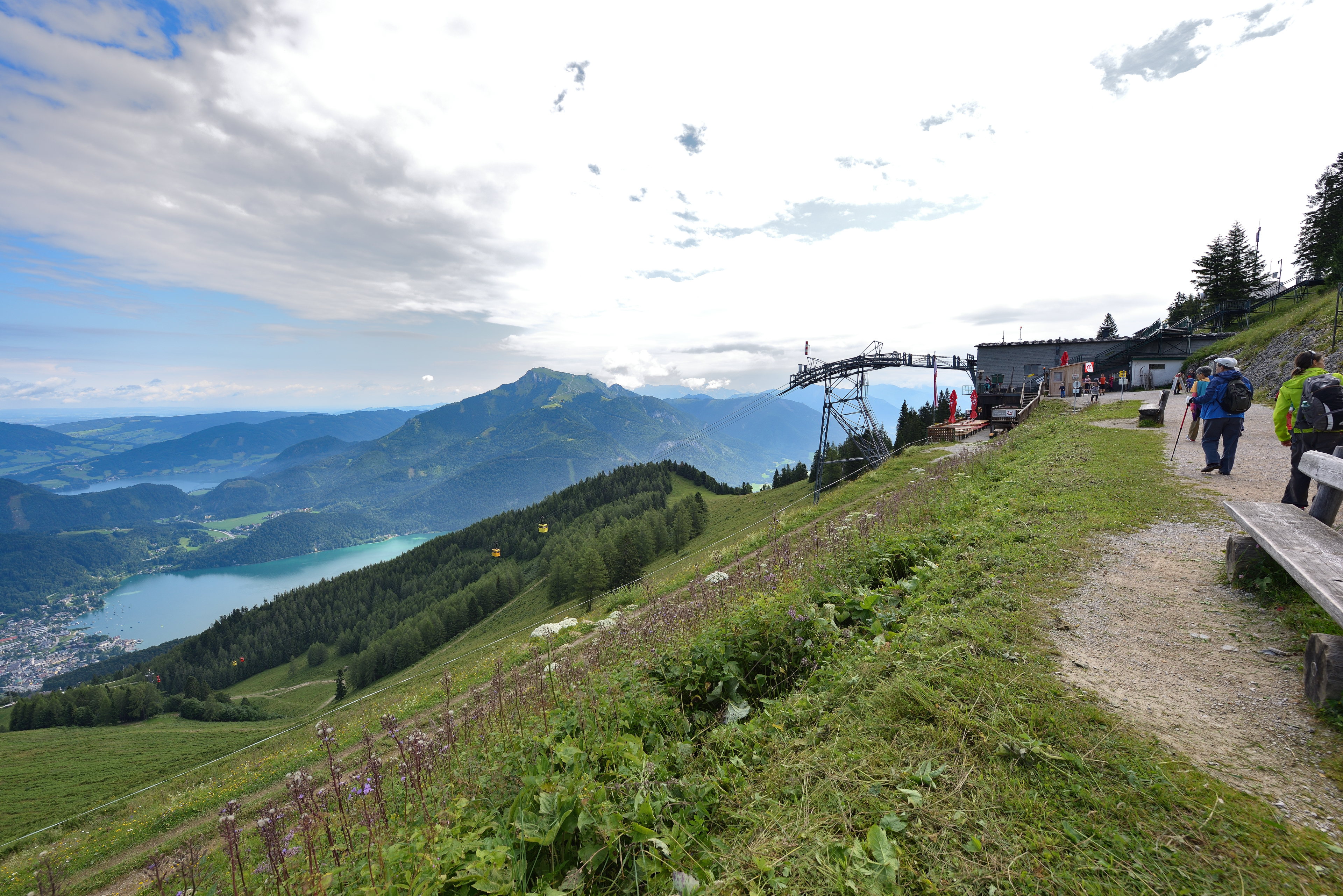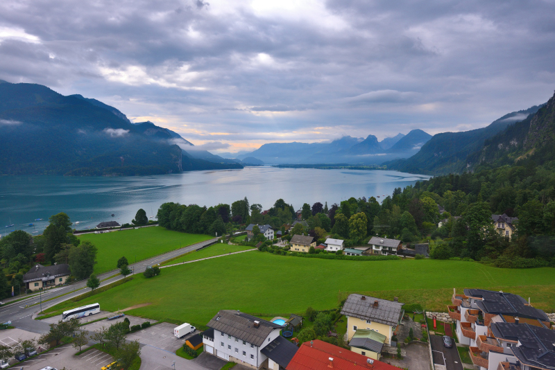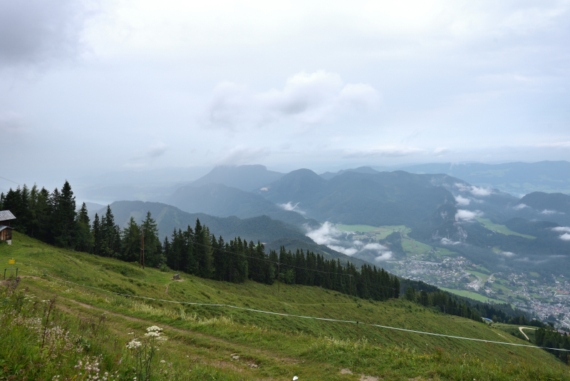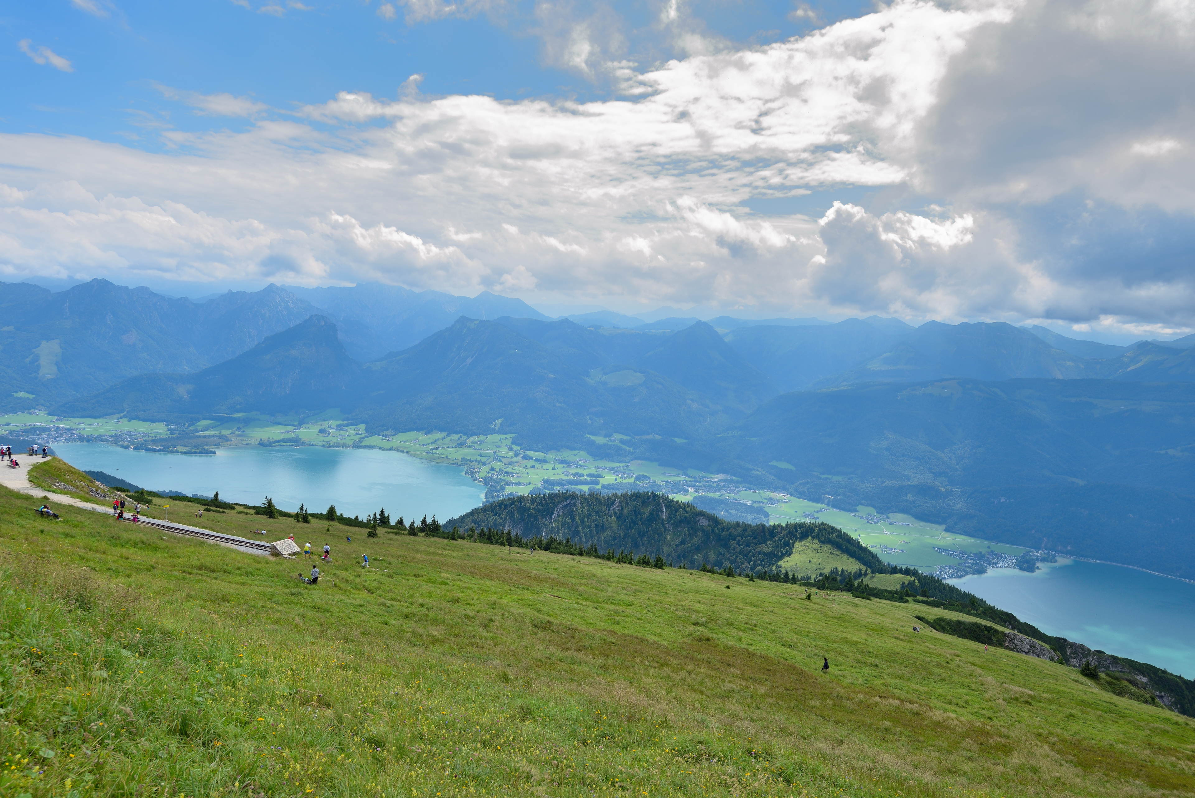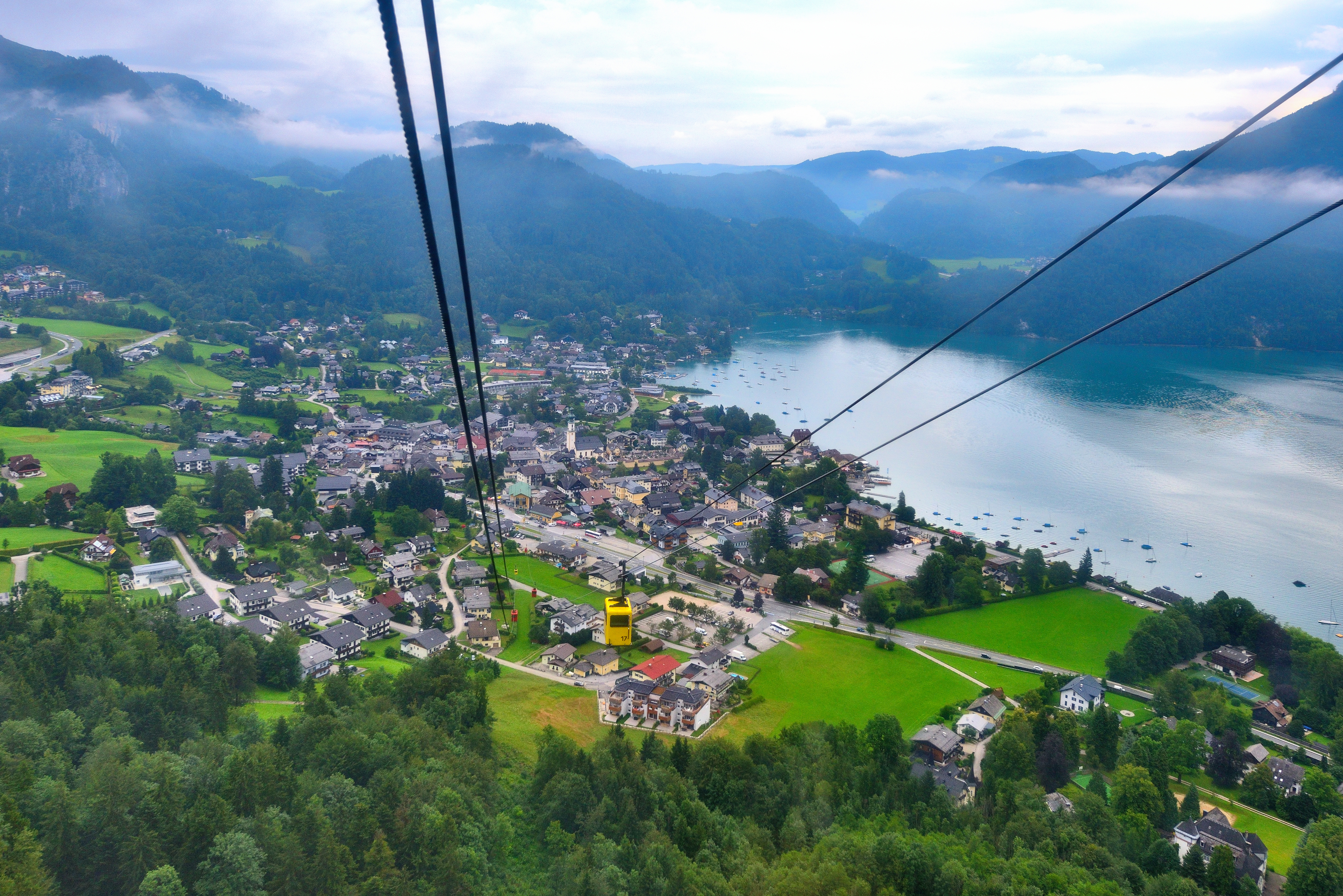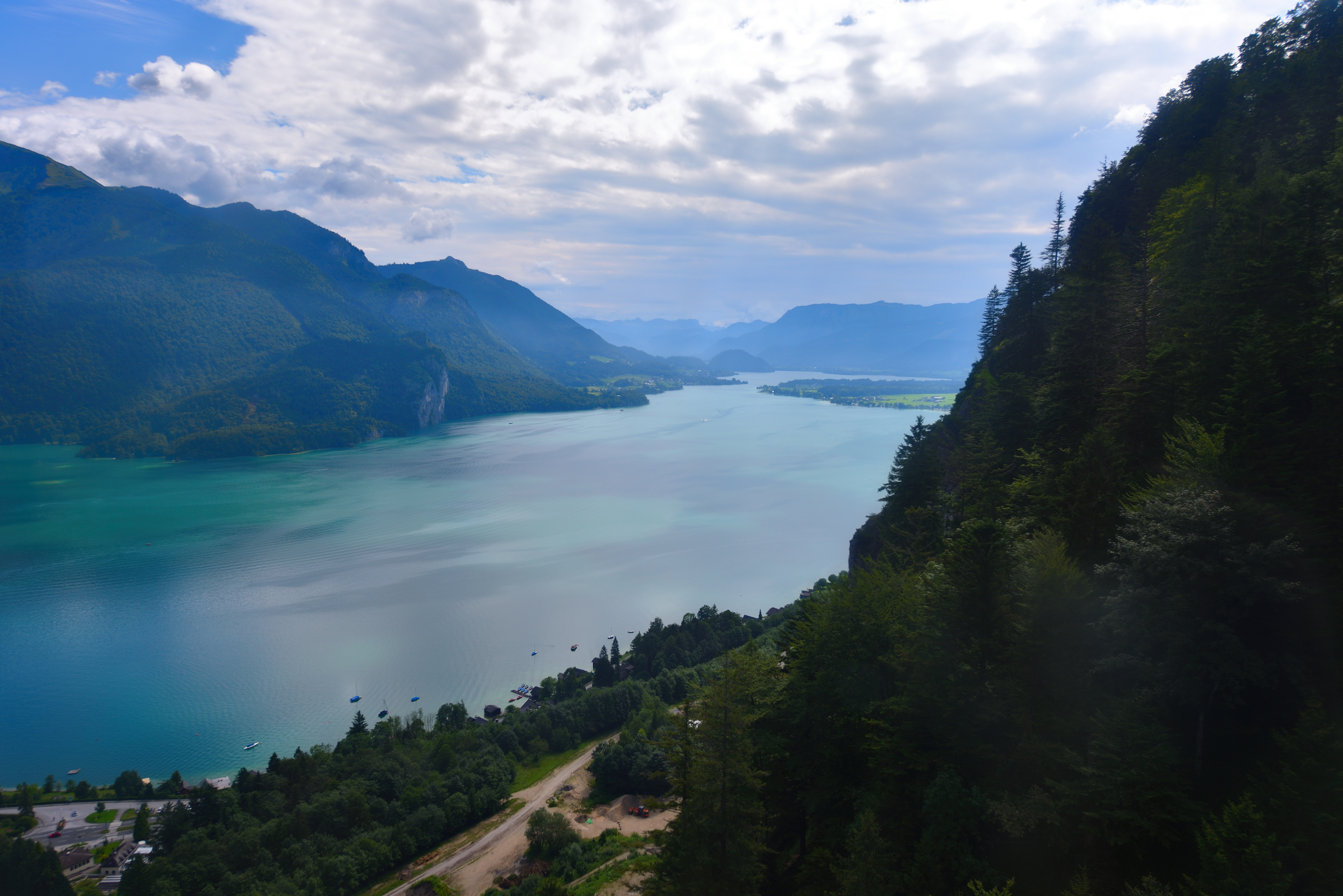 眼下に見えるのは、ヴォルフガング湖 [Wolfgangsee] と、その北西湖畔に位置するザンクト ギルゲン [Sankt Gilgen] の町。