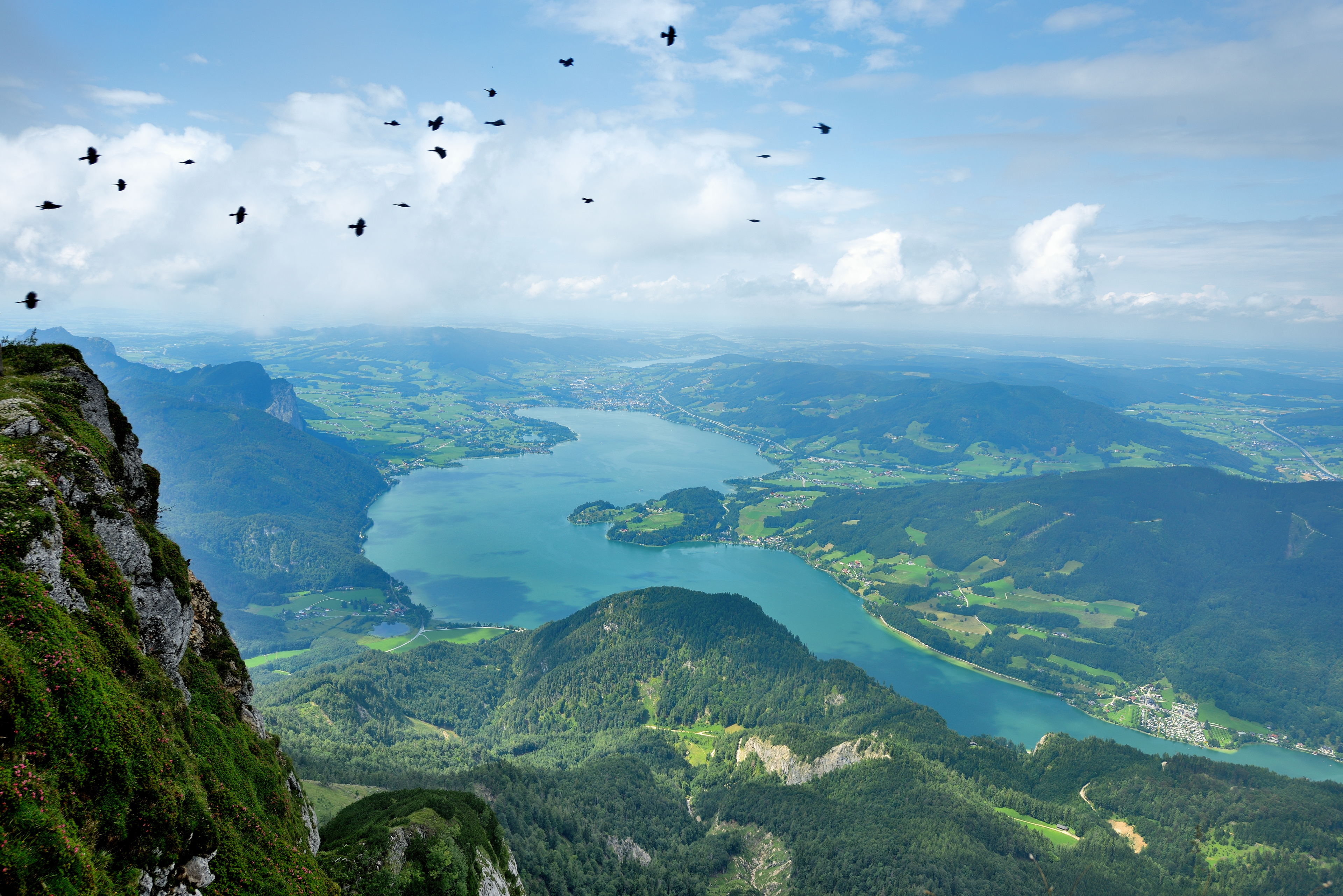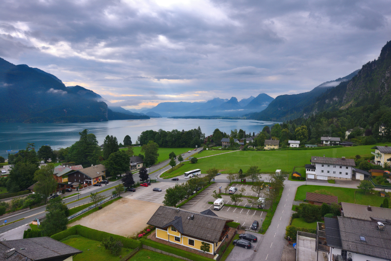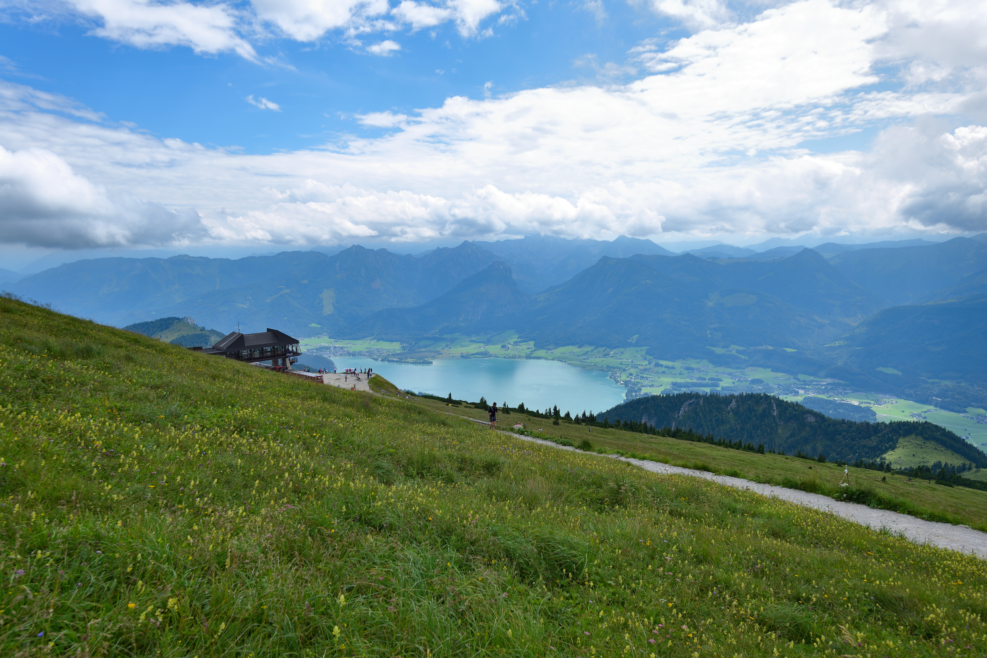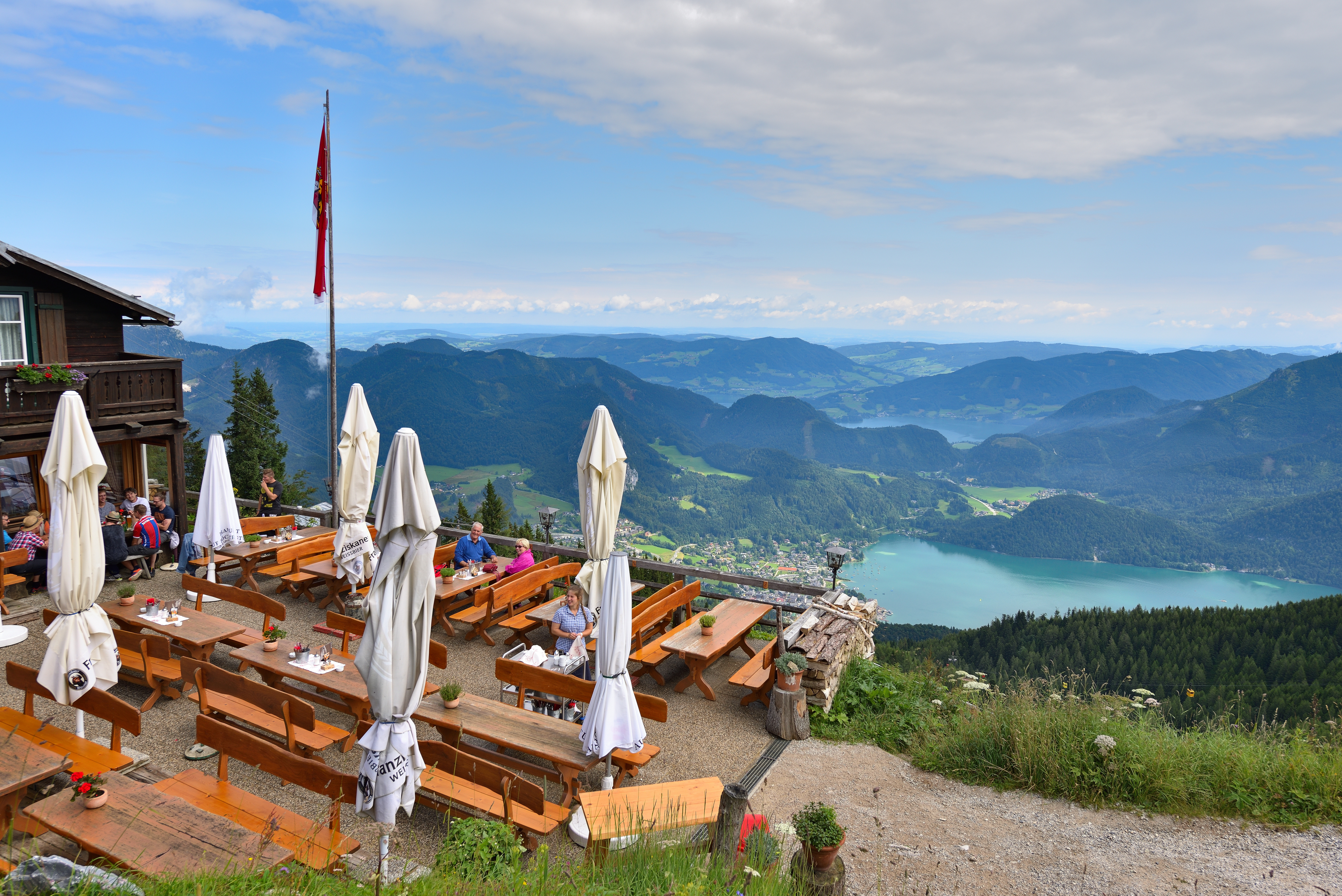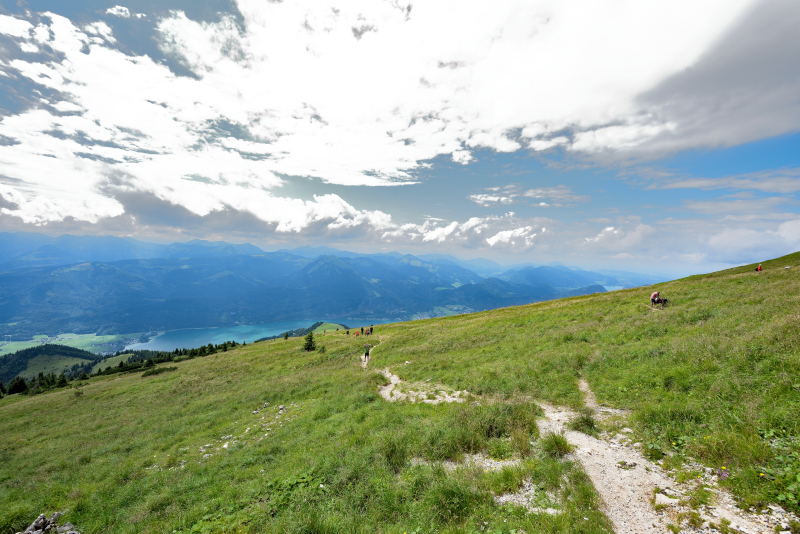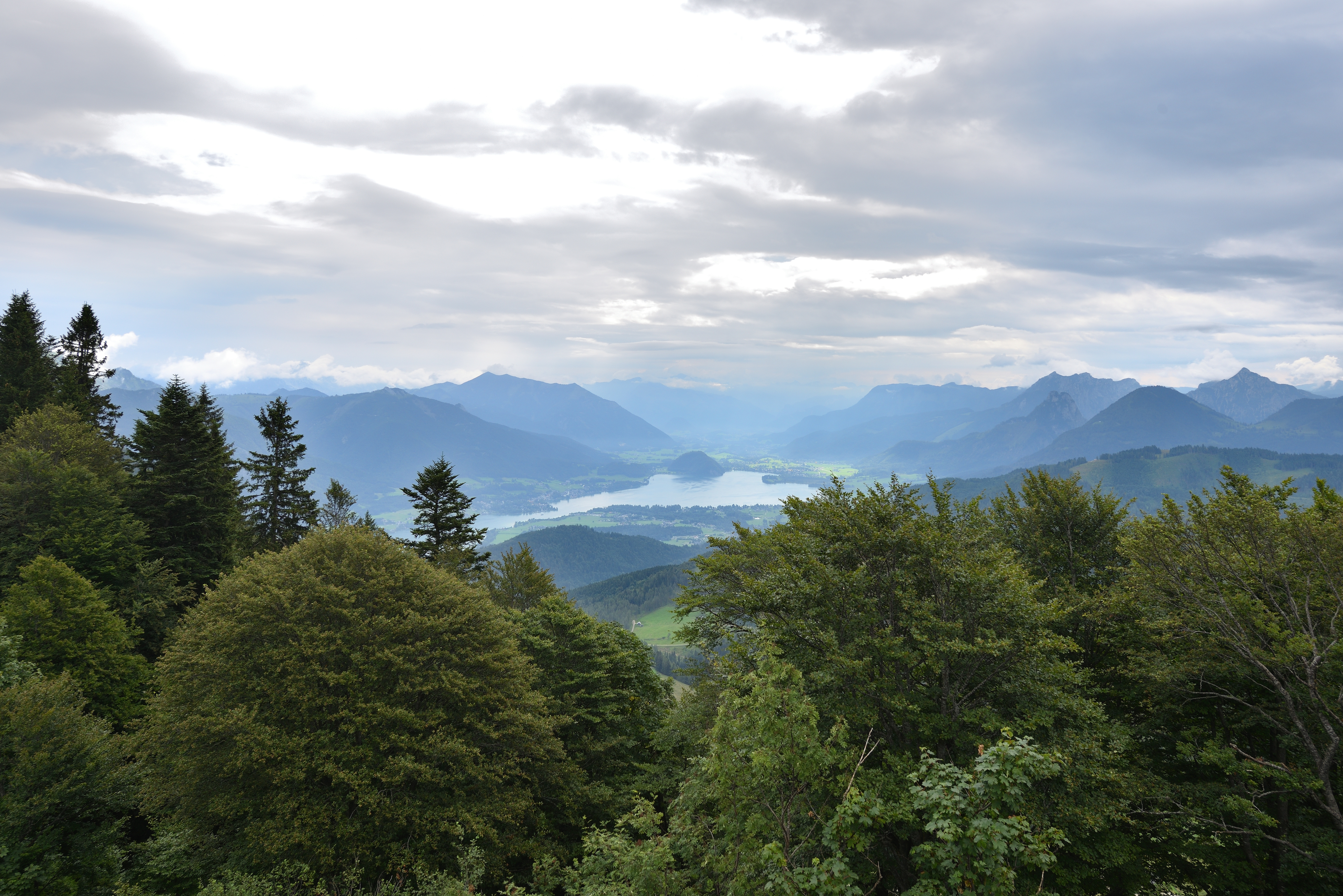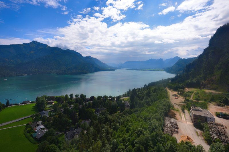 眼下に見えるのは、ヴォルフガング湖 [Wolfgangsee] と、その北西湖畔に位置するザンクト ギルゲン [Sankt Gilgen] の町。