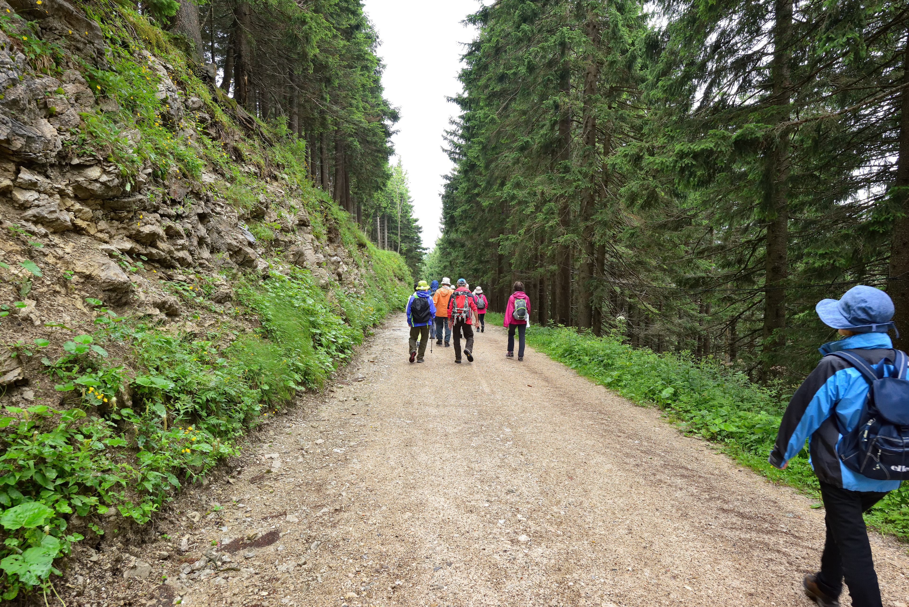 ヨーロッパトウヒに囲まれたトレイルを歩く。