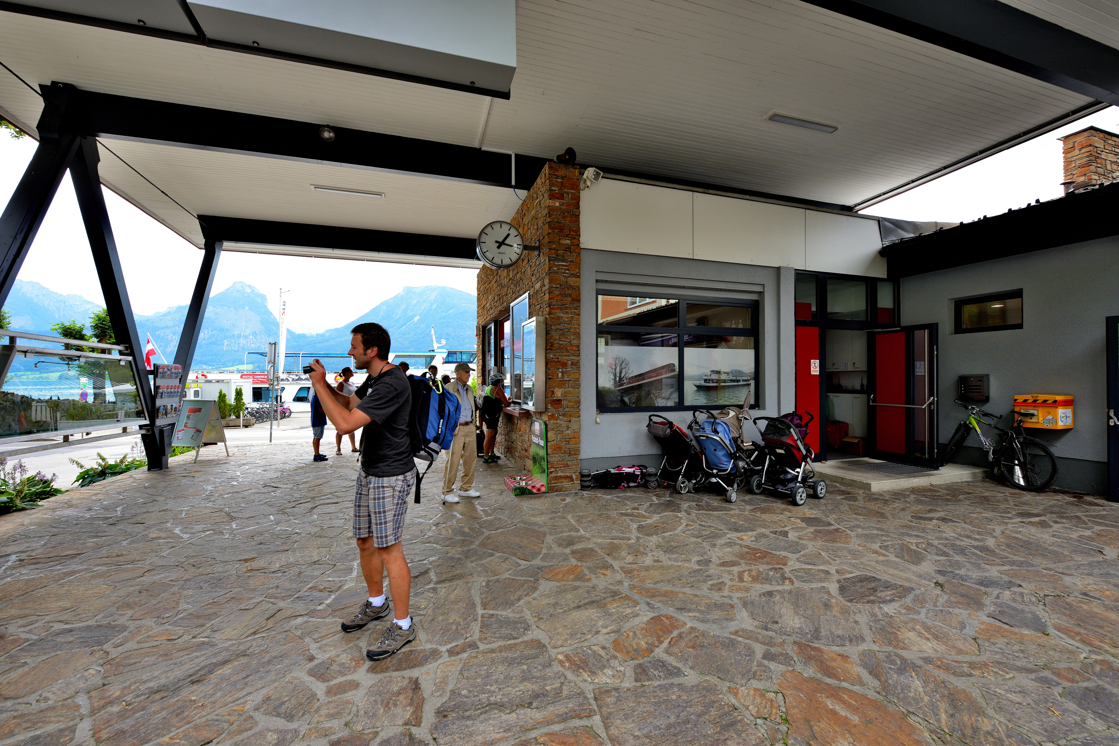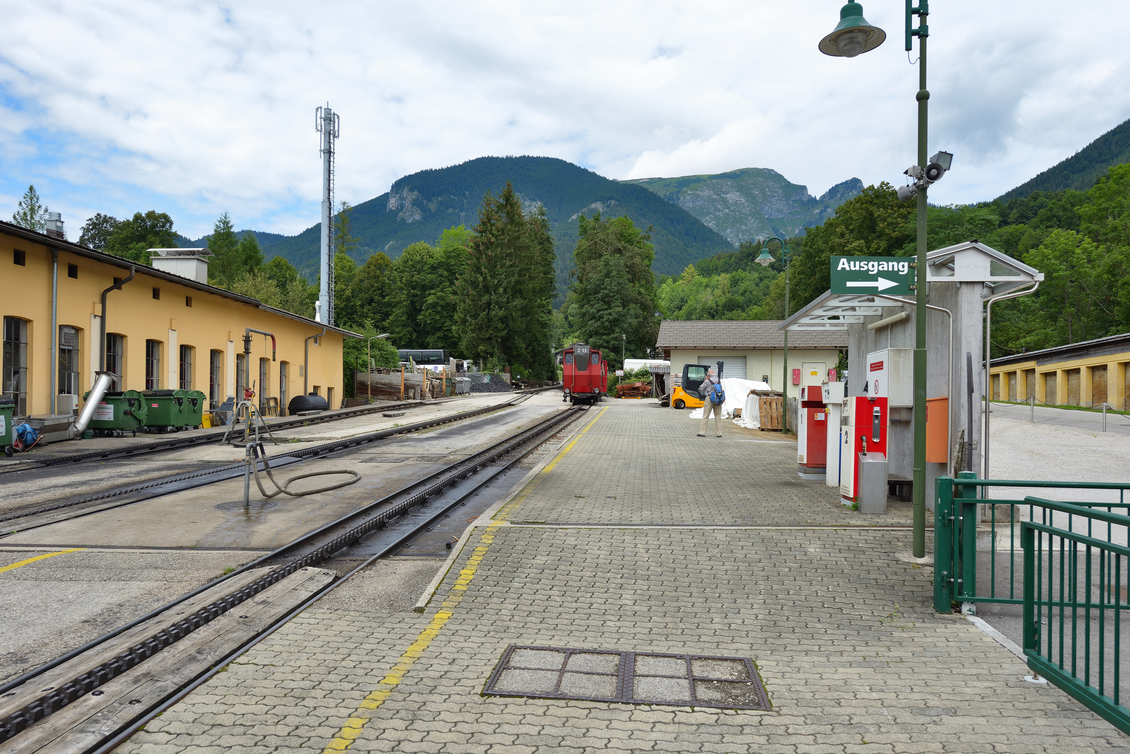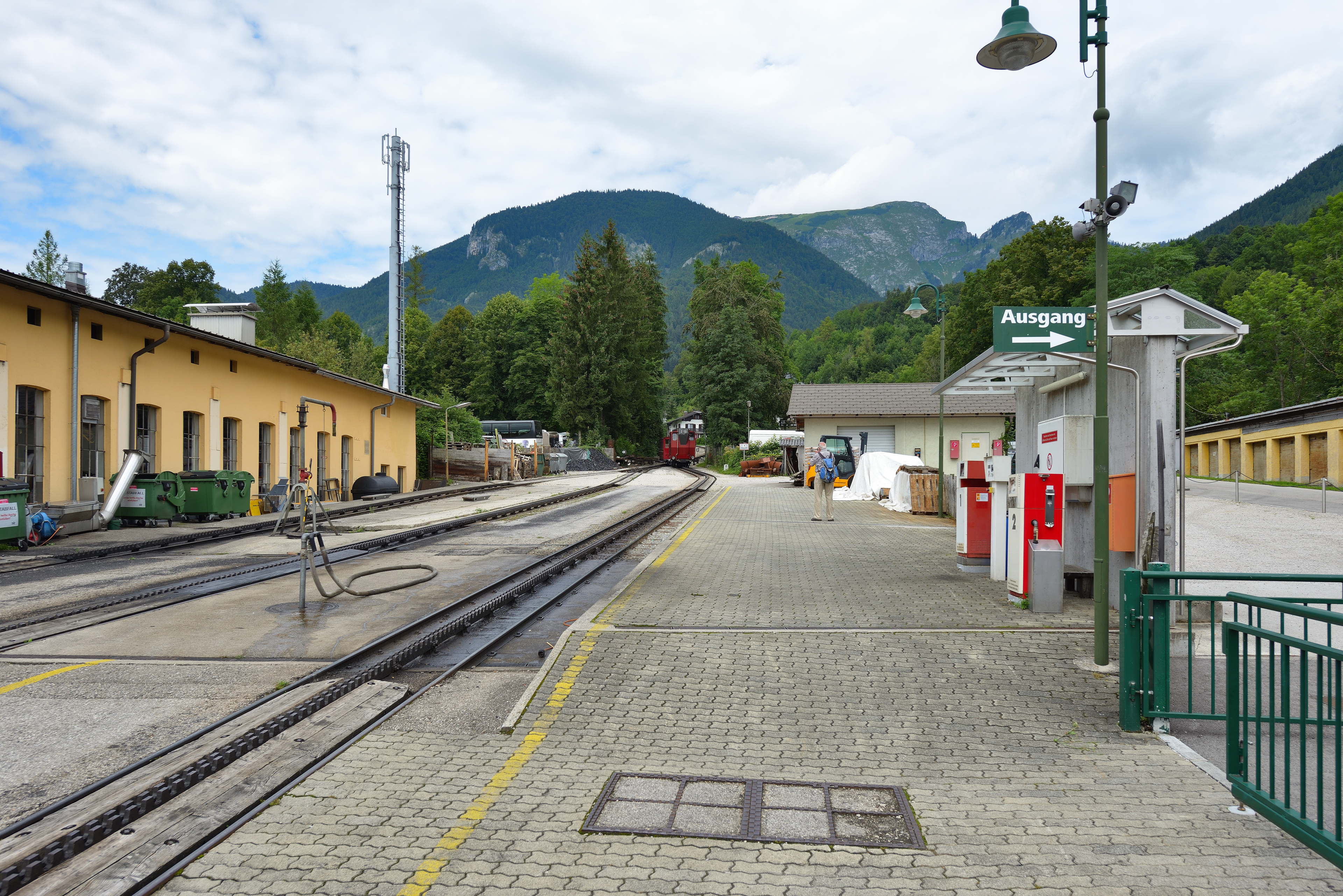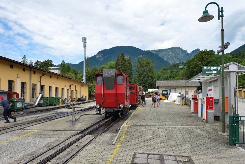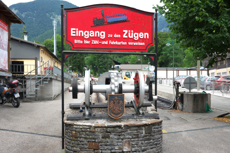 中央やや右の、湖に出っ張った岬に、東岸沿いを走るザルツカンマーグート鉄道駅 "Hallstatt" がある。 ハルシュタットの町はその対岸の西側にあるため、 ハルシュタット駅で降りたら、 駅のすぐ脇にある船着場から約10分の船旅で、ハルシュタットの中心部に渡る事が出来る。