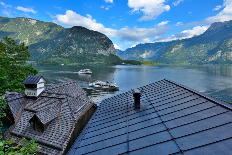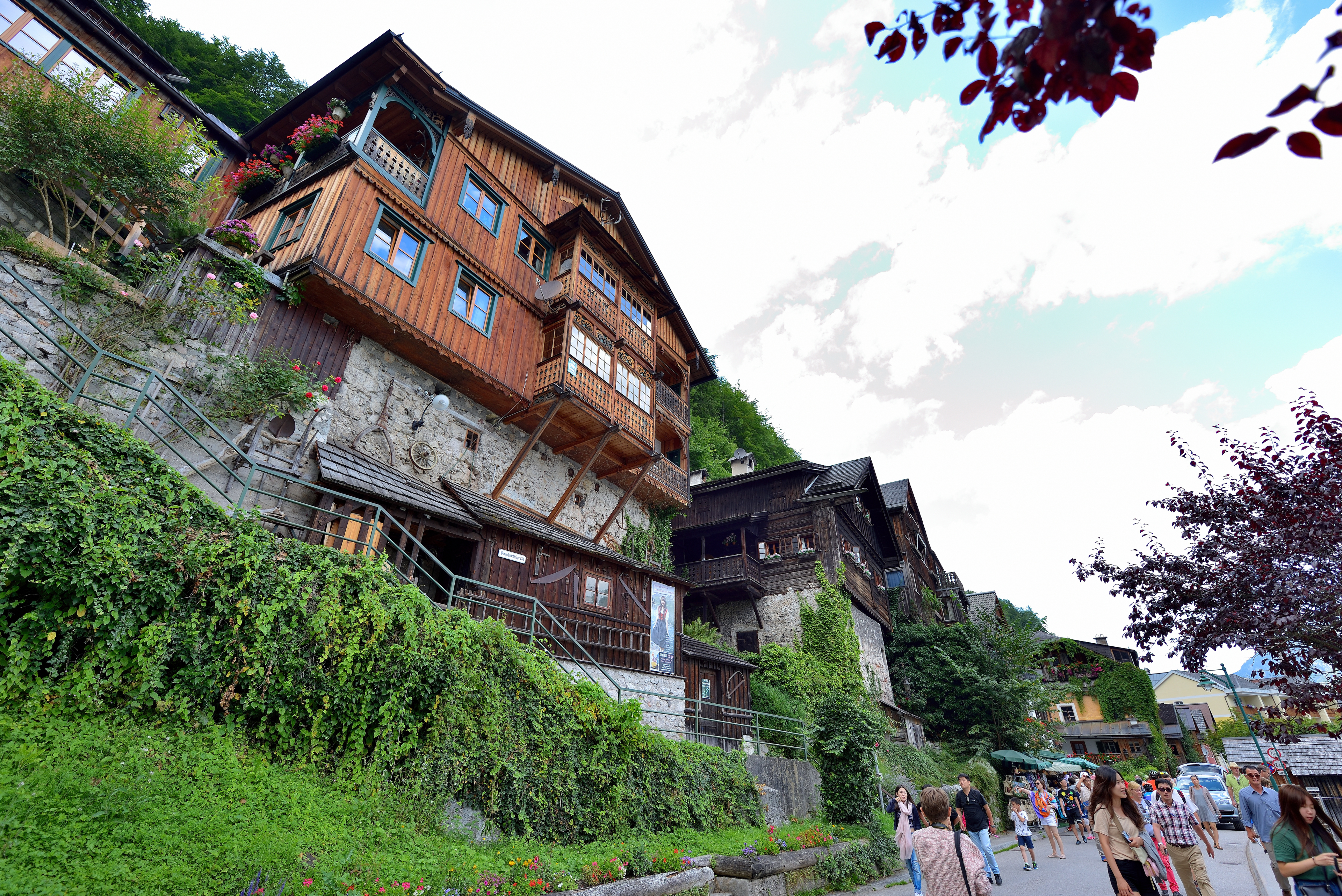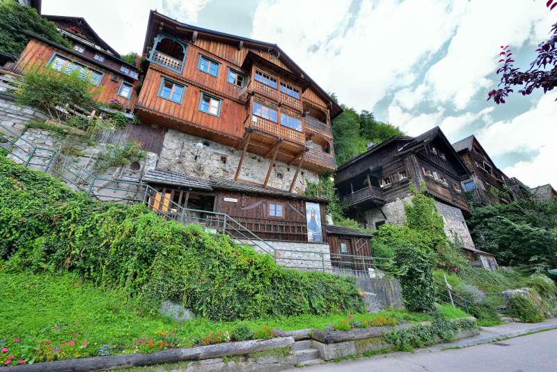 ハルシュタットの町は、湖と急峻な山の斜面の間にある細長い湖岸沿いに、家々が密集しており、湖に杭を打ち込んで建てられたものもある。