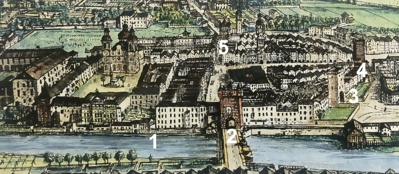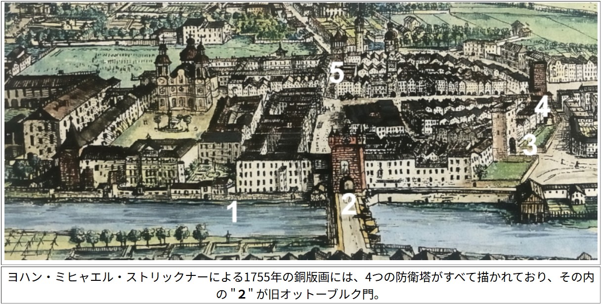 | ヨハン・ミヒャエル・ストリックナーによる1755年の銅版画には、4つの防衛塔がすべて描かれており、その内の "2" が旧オットーブルク門。 |