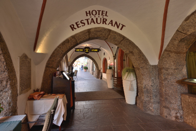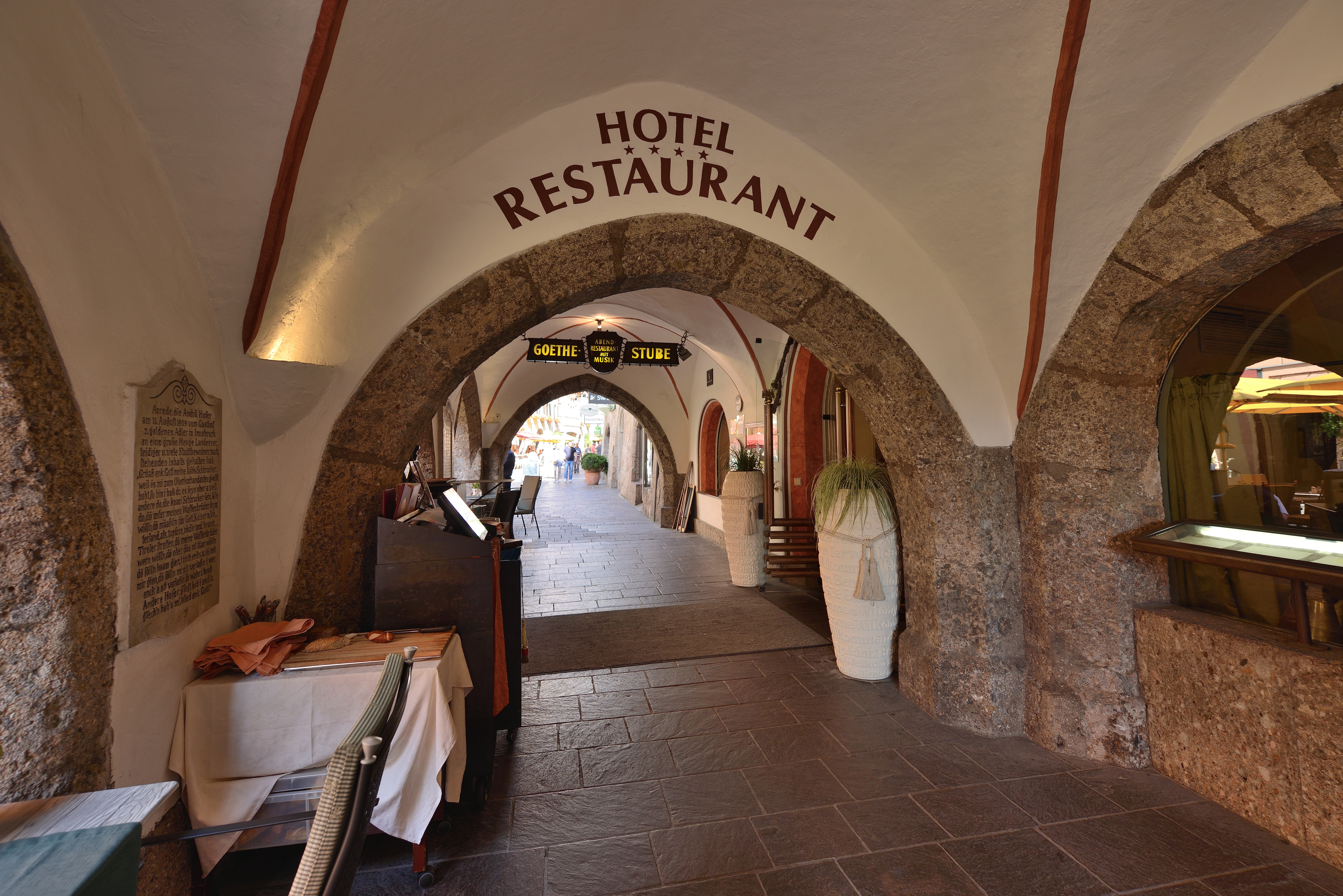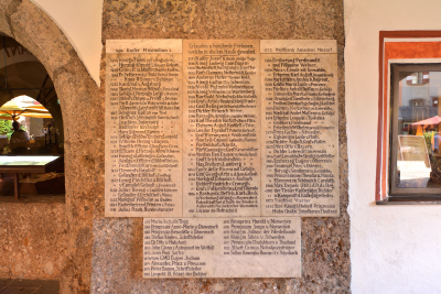 | 右手のドアが、レストランを兼ね備えた、ゴールデナー・アドラー[Goldener Adler] の入り口。 | 有名な宿泊客の名前が刻まれた、4つの名盤がある。 |