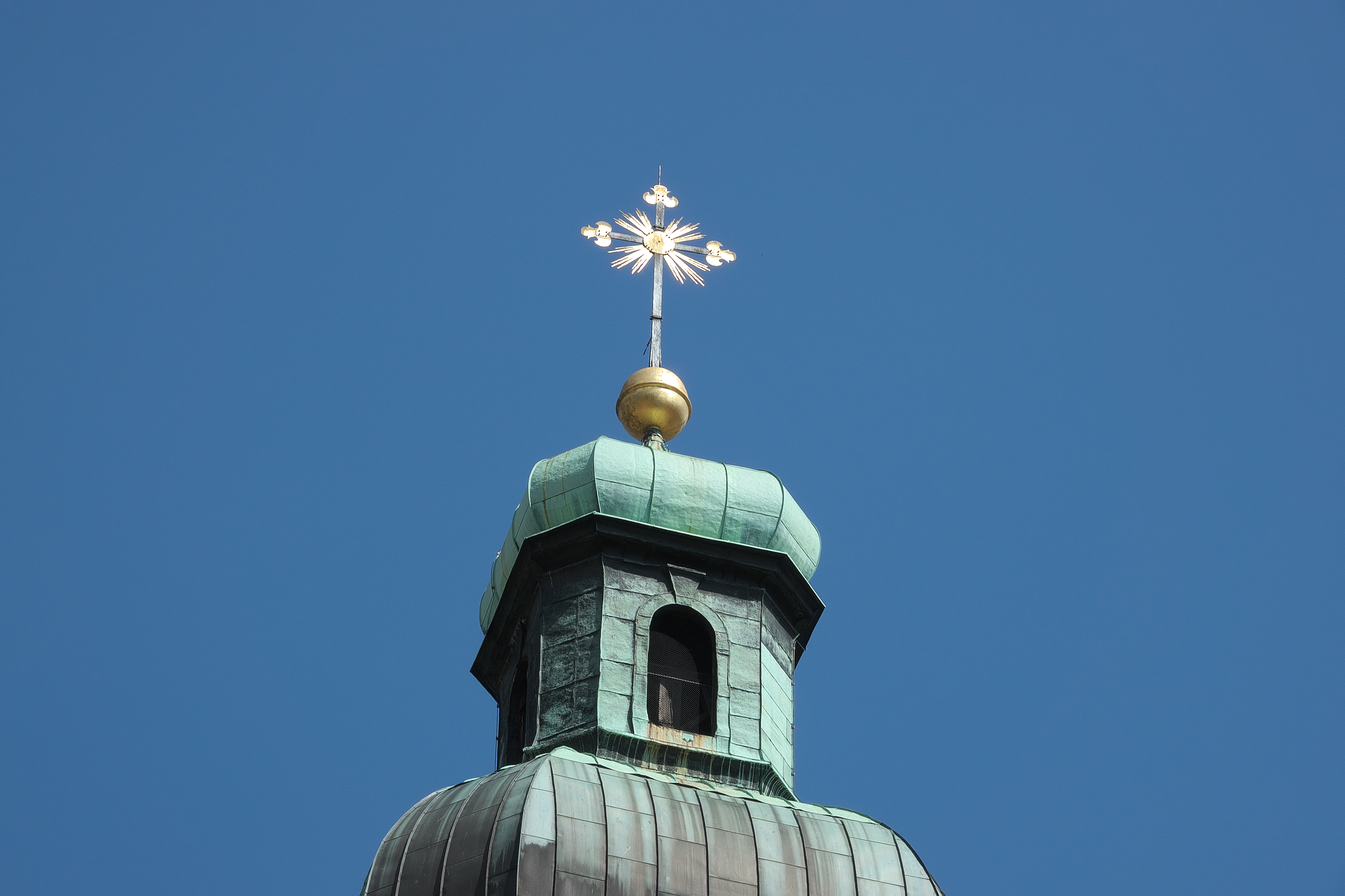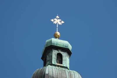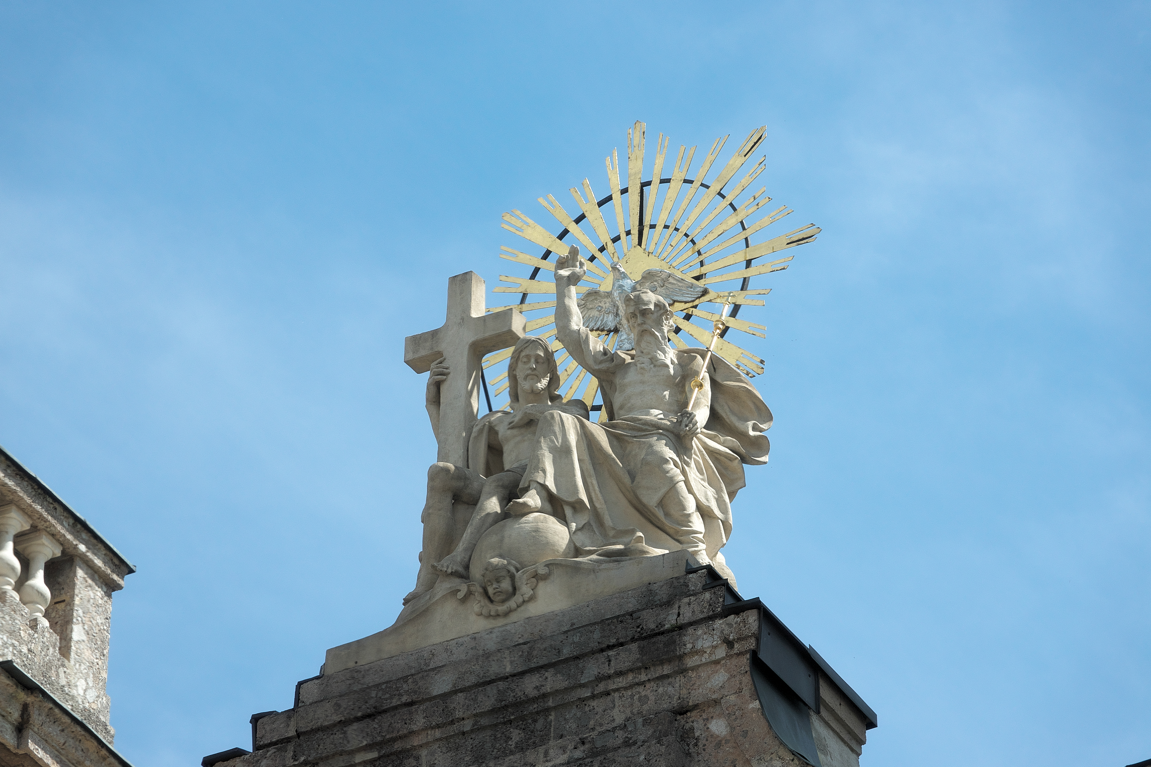 | 教会の屋上に設置された "聖三位一体像" 父なる神 (年配の男性像) 、イエス・キリスト (十字架を持つ男性像) 、そしてその間に配置された鳩 (聖霊の象徴) で構成されている。 像の背後にある放射状に広がる金色の装飾は「光背(こうはい)」または「後光(ごこう)」と呼ばれ、神や仏の超人的な輝きを表現している。 |