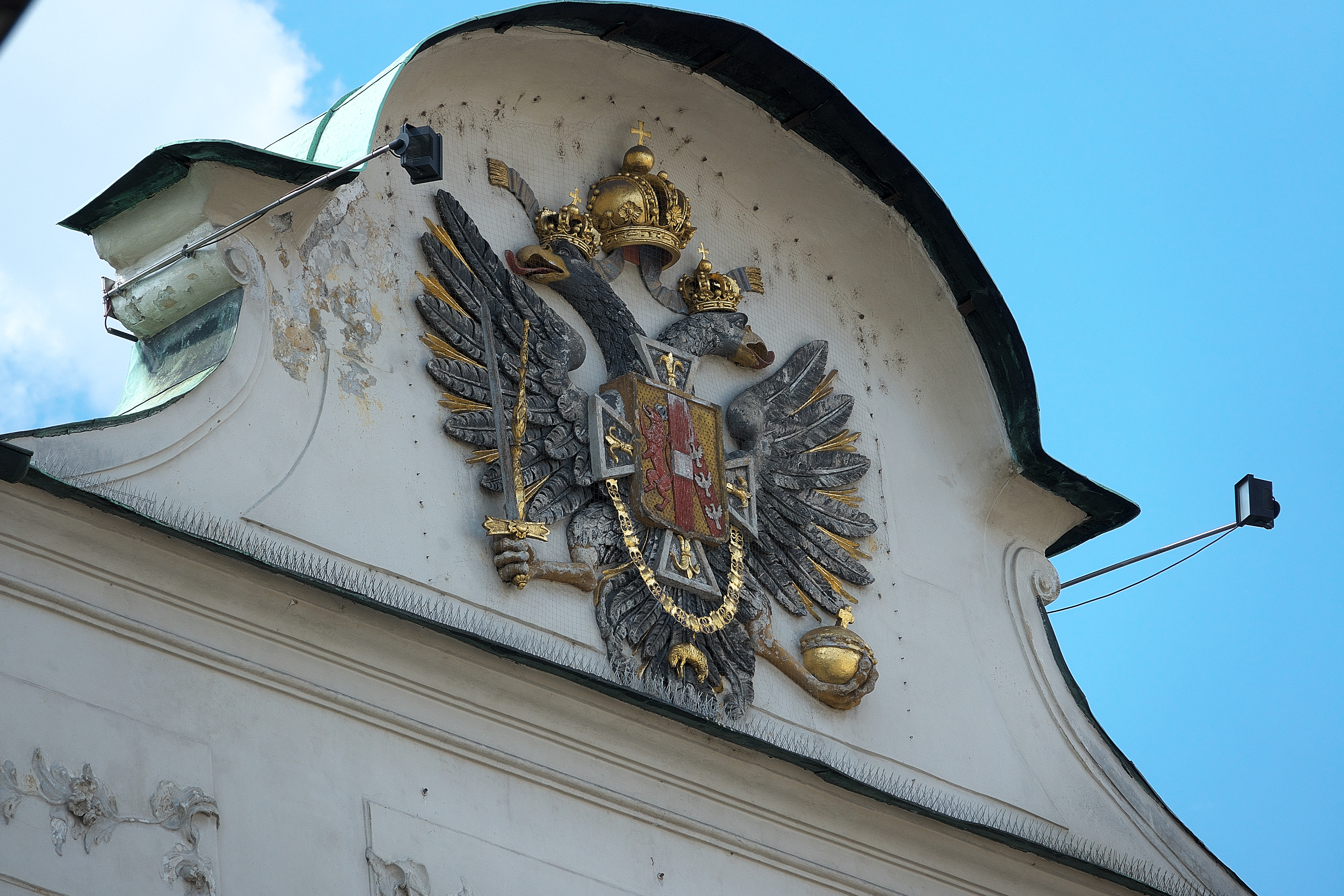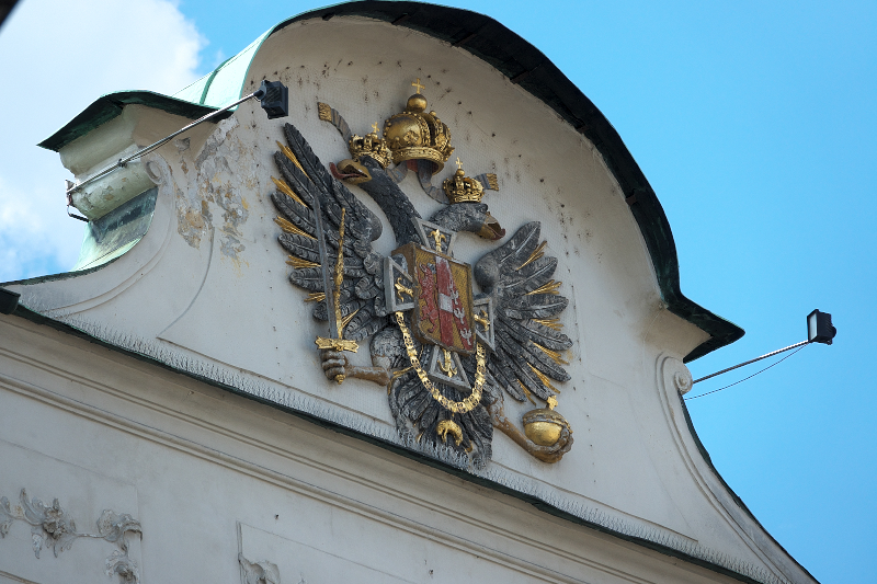 | 建物の切妻に設置されていのは、インスブルック王宮 [Hofburg Innsbruck] の紋章 紋章は、オーストリア=ハンガリー帝国時代の双頭の鷲 (ダブルイーグル) のデザインを特徴としている。 鷲は剣と王笏(おうしゃく)及び、宝珠をそれぞれ掴んでおり、胸には盾が描かれている。 「北西」MAP Lay.B |