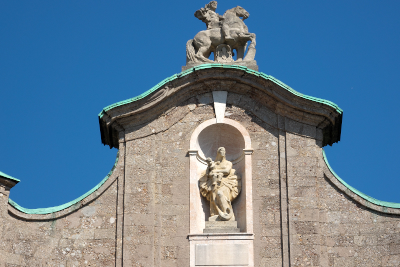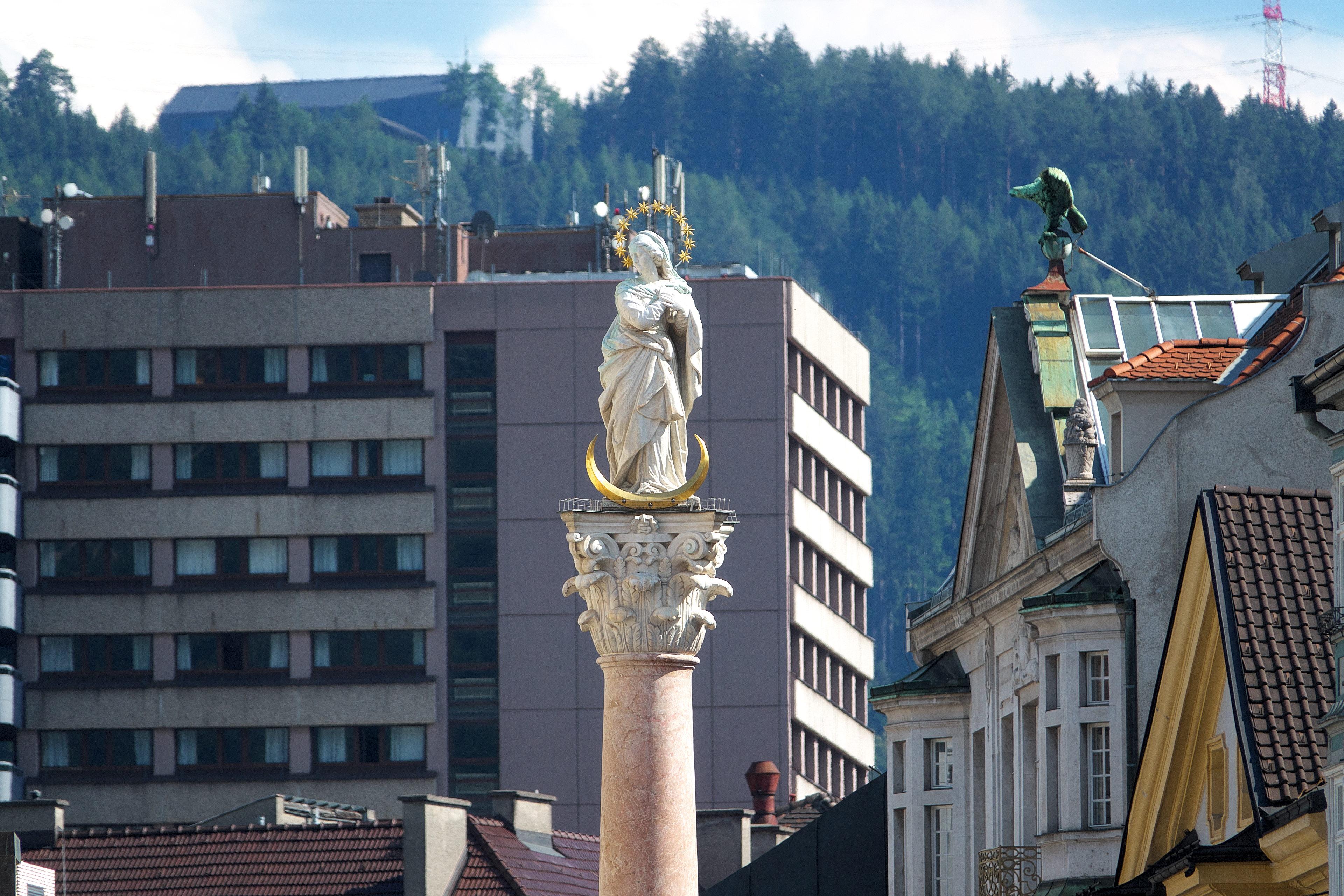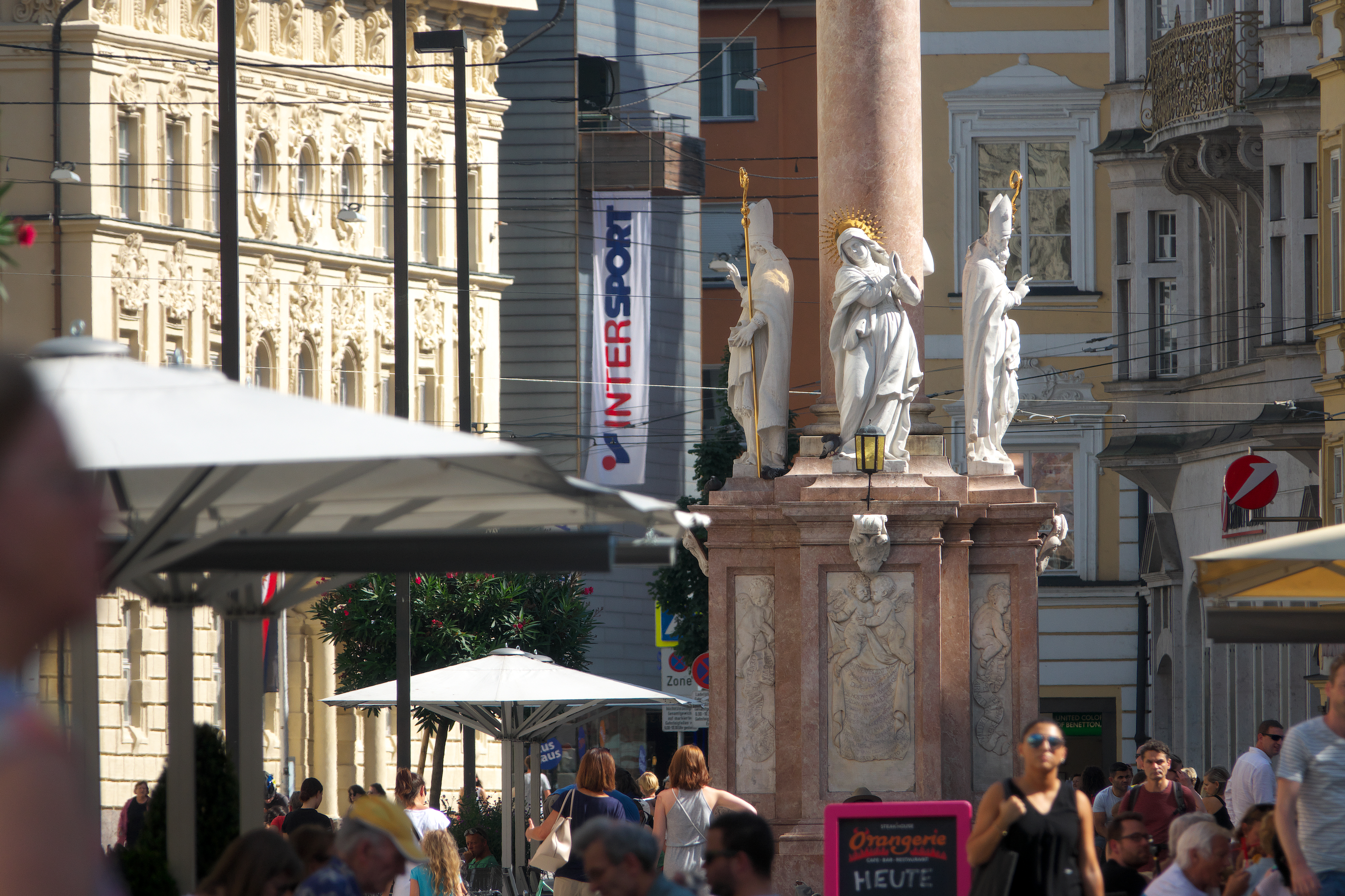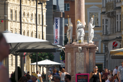| 聖アンナの記念柱 [Annasäule] (18:03) 1703年7月26日、スペイン継承戦争の一環として、聖アンナの日 (7月26日) に最後のバイエルン軍がチロル地方から追放されたことにちなんで、1704年、議会はこの出来事を記念して記念柱を建立することを誓約し、マリア・テレジア通りの中央に聖アンナ記念柱が建立された。 コリント式の記念柱は、赤い大理石で造られており、柱の頂には聖マリア像が据えられている。 そして柱の周囲には、聖カシアン、聖ウィギリウス、聖ゲオルク、聖アンナの像が配置されている。 これらは、クリストフォロ・ベネデッティ [Cristoforo Benedetti] によって建立された。 「南南東」MAP Lay.B |