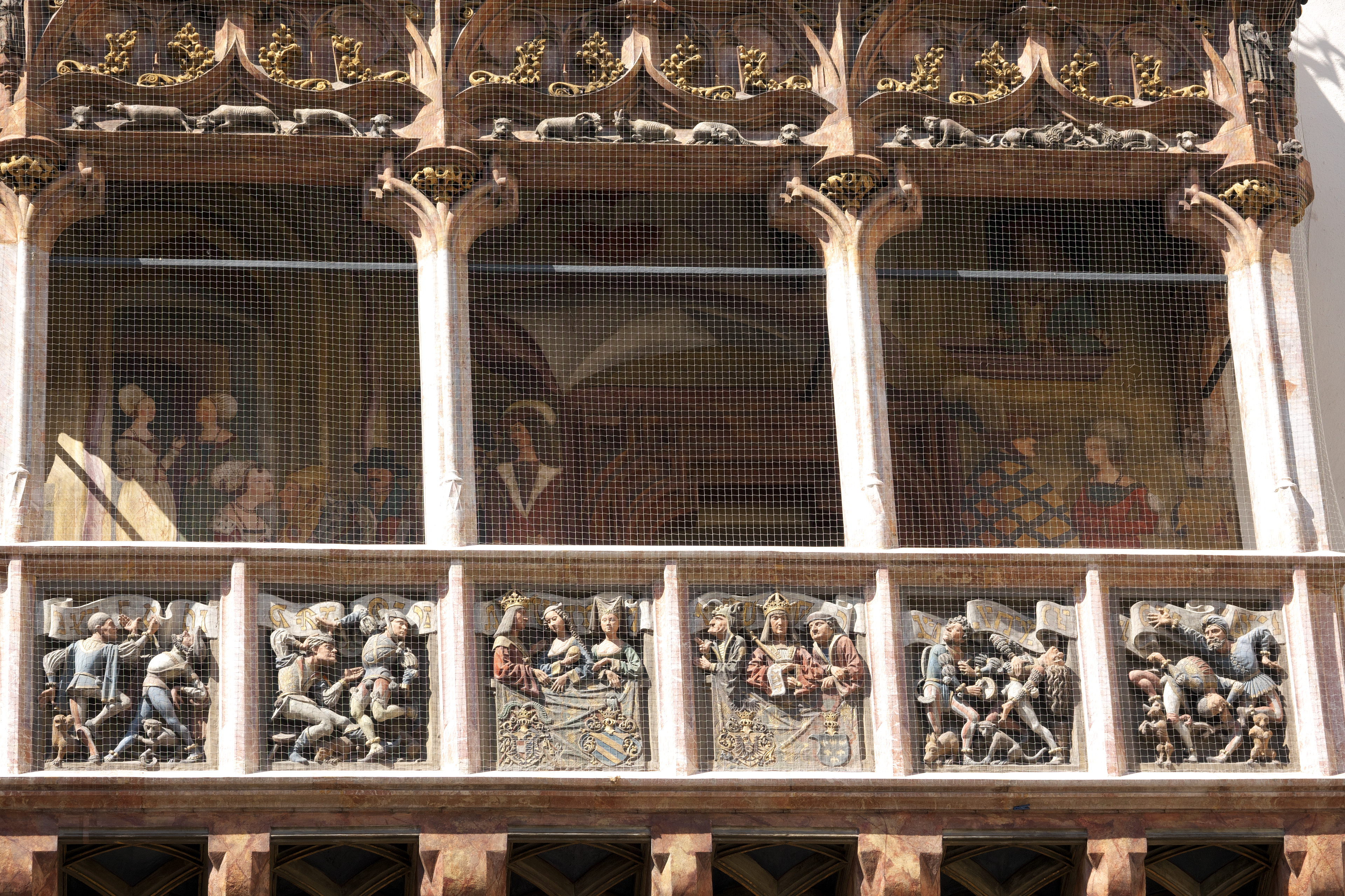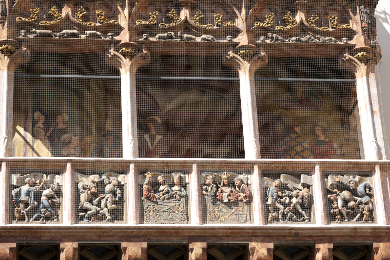 | 黄金の小屋根 [Goldenes Dachl] (15:50) 旧市街のほぼ中心、張り出した出窓 (エルカー) の上に黄金色に輝く小屋根は、皇帝マクシミリアン1世が広場で行われる行事を見物するために、1494~1496年に造らせたもの。 屋根は金箔を施した2657枚の銅板瓦で覆われ、バルコニーの手すり部分には6枚の精緻なレリーフがはめ込まれている。 このレリーフの左から3番目には、皇帝とその2番目の妻 "ビアンカ・マリア・スフォルツァ" が手にリンゴを持ち、その右側には最愛の最初の妻 "マリア・ド・ブルゴーニュ" (落馬で死亡) の姿が刻まれている。 「北」MAP Lay.B |
