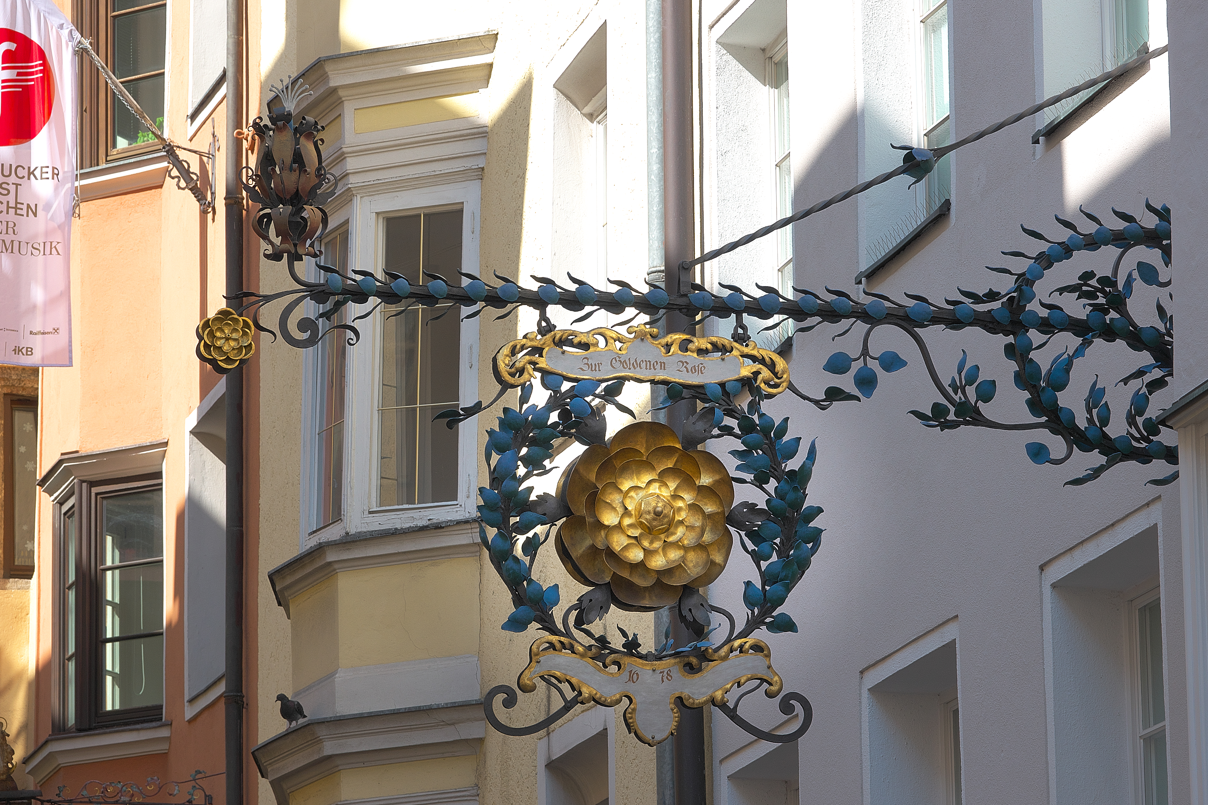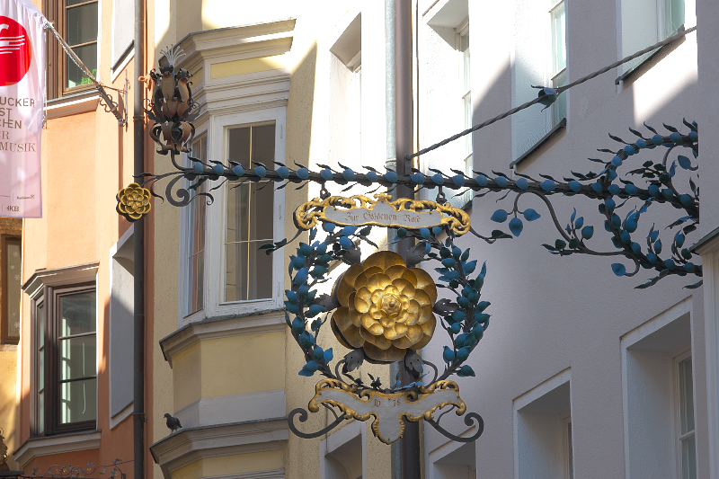 | 金色のバラの看板は、ツア・ゴールデネン・ローゼ [Zur Goldenen Rose] いう歴史的な建物の、装飾的な錬鉄製看板として知られている。 ドイツ南部やオーストリア等では、このような精巧な錬鉄製の看板が街並みの特徴となっている。 因みに、この建物は、ガストハウス (伝統的な宿屋・レストラン) を営んでいる。 | ||||