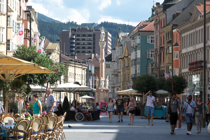 | マリア・テレジア通り [Maria-Theresien-Straße] (20:03) 通りの真ん中に、ノルトケッテの山々を背景にした大理 石製のアンナ記念柱Annasäule が立っている。 この辺りは2010年に歩行者専用ゾーンとして整備さ れ、 町歩きやショッピングがより快適に楽しめるようになっ た。 夕方になると、レストラン前の路上にテラス席が設けられ、多くの人々が飲食を楽しんでいる。 「北北西」MAP Lay.B |