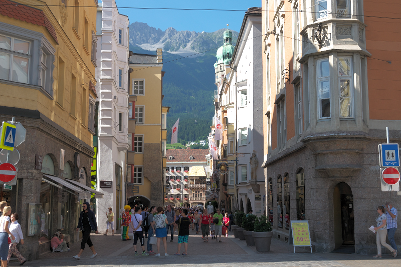 | ヘルツォーク・フリードリヒ通り [Herzog-Friedrich-Straße] (16:49) 前方に見える建物は、黄金の小屋根 [Goldenes Dachl] 。 通りの右手に見える塔は、市塔 [Stadtturm] 。 バックに見える山々は、ノルトケッテ [Nordkette] 山脈。 (最高峰は2,637 m) 「北」MAP Lay.B |