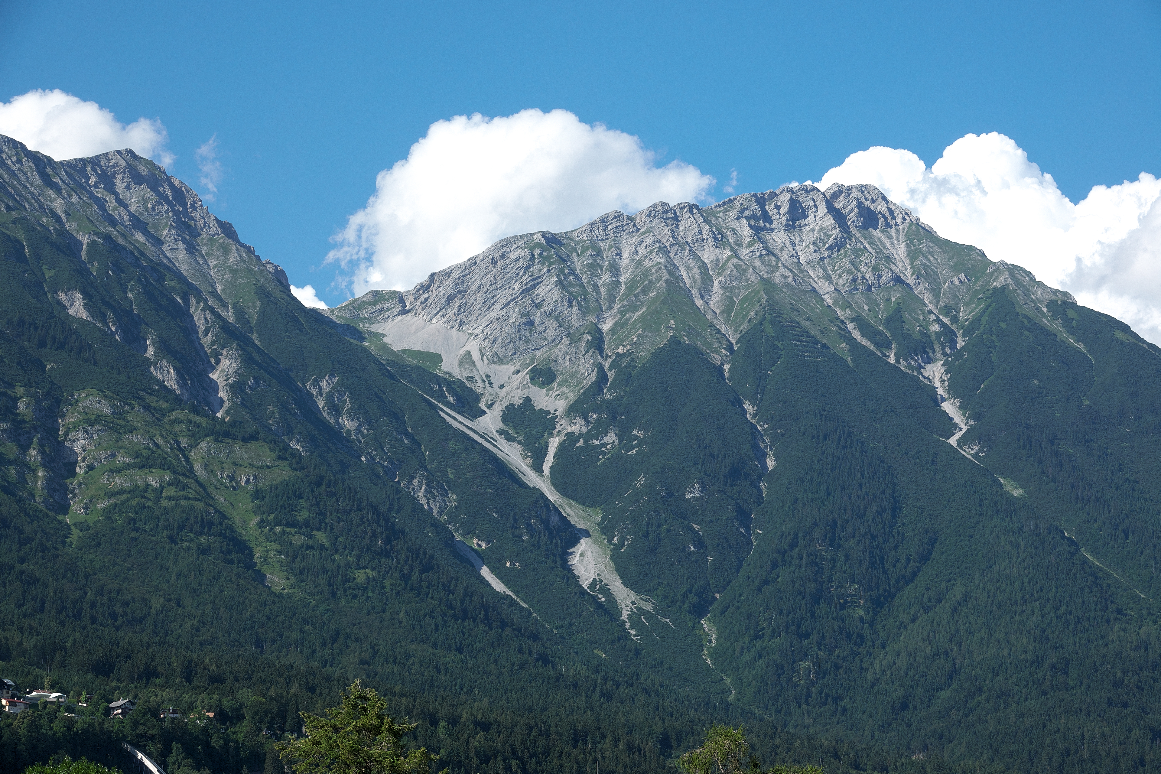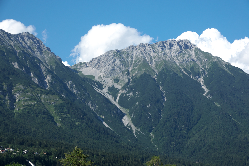 | ホテル・グラウアー ベア [Hotel Grauer Bär] のベランダからの眺め (17:14) 山の名は、ルマーシュピッツェ [Rumerspitze], 2454 m 、街の標高は、577m。 この後、夕食のため、再び市街のレストランへ向かう。 「北北東」MAP Lay.B |