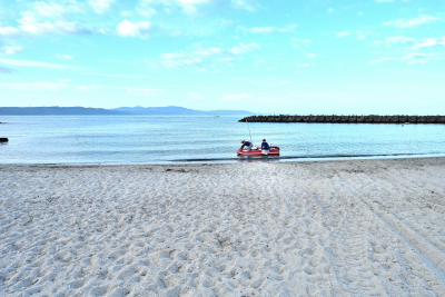 | 撮影地点 MAP "浜の散歩道"に沿って設けられた防波堤の一部は、駐車場から海へのアクセスを容易にするため開かれた状態になっている。 例えば、車で運んできた、レジャーボートや釣りボート等、海への運搬が容易に行える。 |